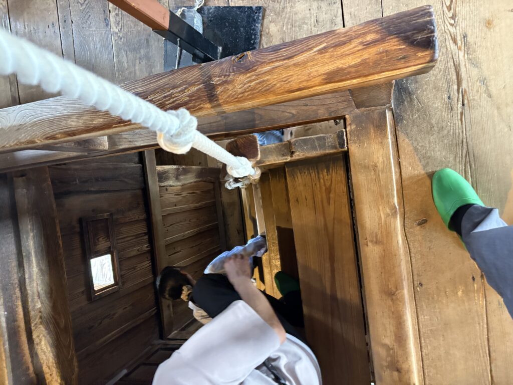 中へ入るとまず驚かされるのが、非常に急な階段。観光用に補助縄が取り付けられていましたが、思わず足を滑らせそうでヒヤヒヤしました。